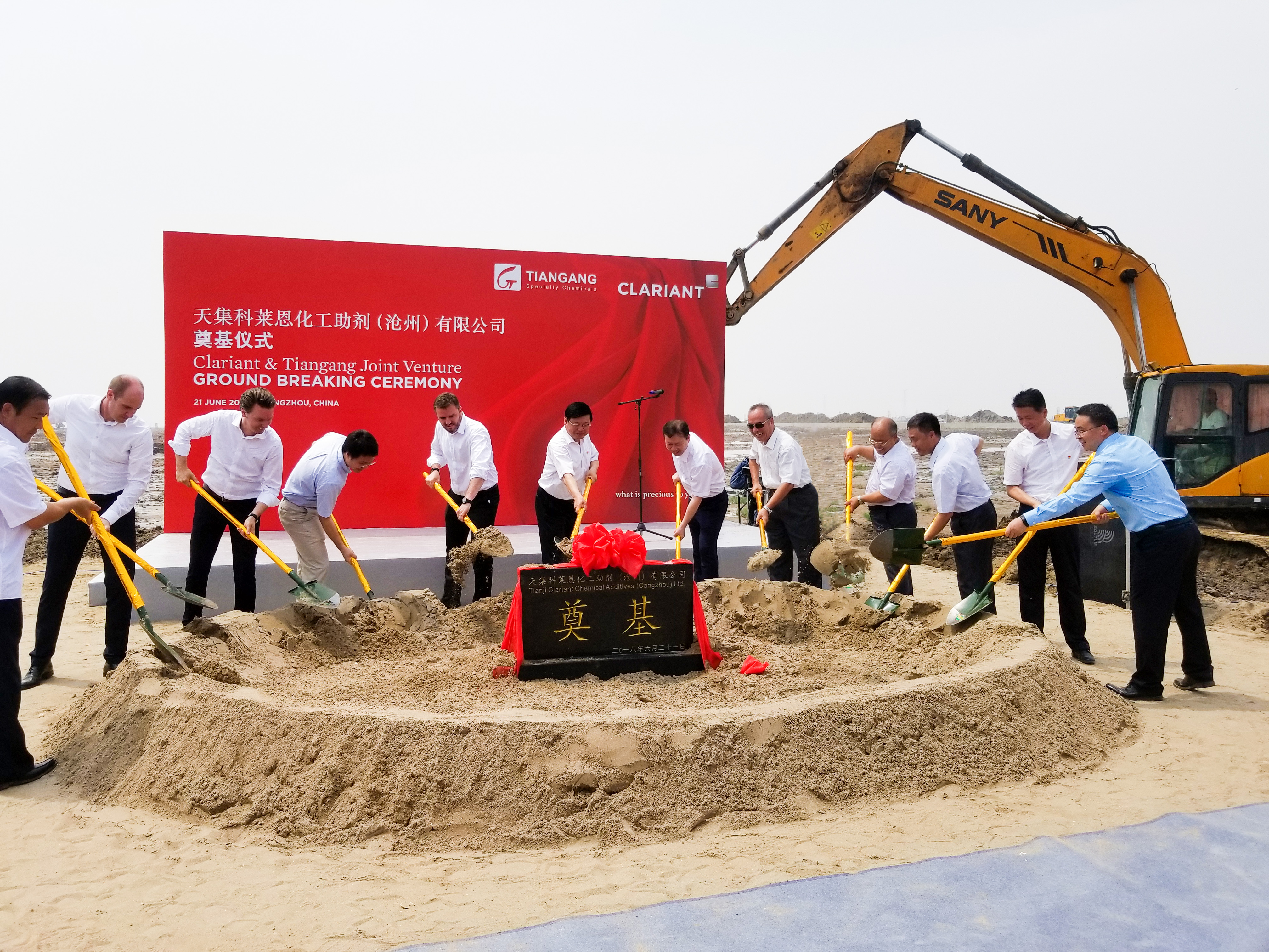 Shanghai, June 21, 2018 – Clariant, a world leader in specialty chemicals, and Beijing Tiangang Auxiliary Co., Ltd. (Tiangang), today conducted a groundbreaking ceremony in Cangzhou (China), just over 200 km south of Beijing. The ceremony marked the start of the construction of a world-class production facility for stabilizers for plastics and textiles that will form the heart of the joint venture between both parties. The event was marked by a special event with representatives from both companies, as well as local officials.
