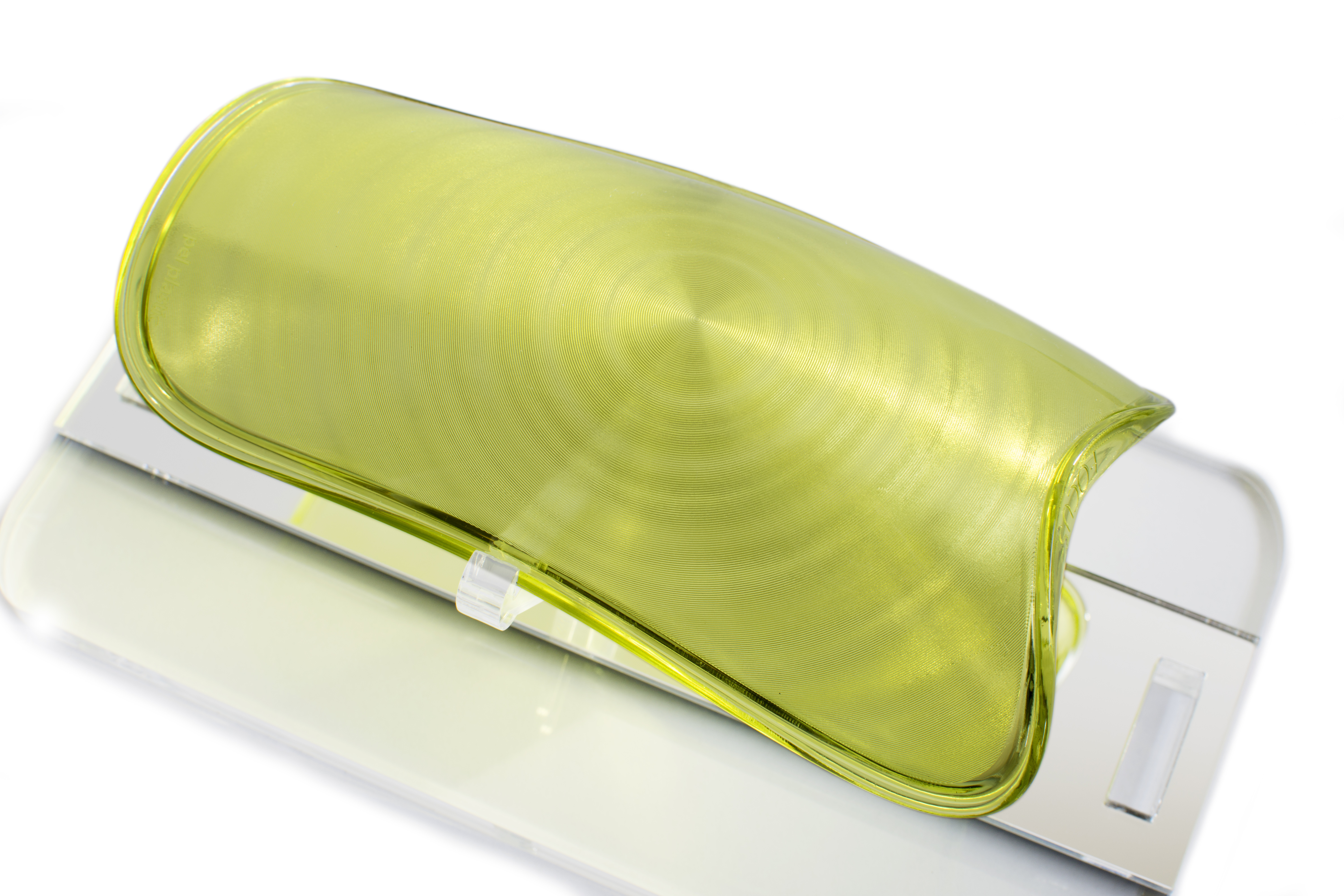 Having settled on their color, the Pel Plastic team began working on the texture that would be applied to the molded plastic. The result is very much in line with the trend theme, enigmatic, somewhat contradictory and distracting, but eventually resolving itself to bulls-eye focal point. The clear polymer – polycarbonate – and the transparent color are rendered translucent, almost opaque, by the texture. The exterior surface of the prototype – a standard shape Pel Plastic uses to evaluate textures – is absolutely smooth, while the texture is created on the inside or backside of the part. This construction creates depth and an almost pearlescent appearance, despite the fact that there are no pearl pigments in the color.