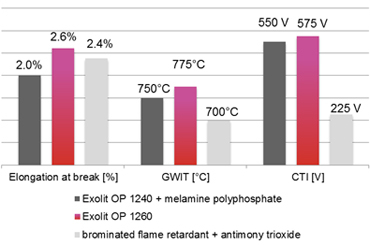 Graph showing the excellent performance of Exolit OP 1260 in PBT GF 30 UL 94 V-0 Compounds: mechanical (best elongation at break), flammability (best glow wire test, GWIT, performance) and electrical properties (best comparative tracking index, CTI. Source: Clariant data.